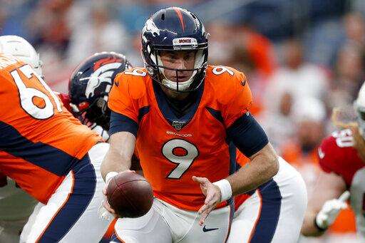 Denver Broncos quarterback Kevin Hogan (9) hands off against the Arizona Cardinals during the first half of an NFL preseason football game, Thursday, Aug. 29, 2019, in Denver. (AP Photo/David Zalubowski) The Associated Press