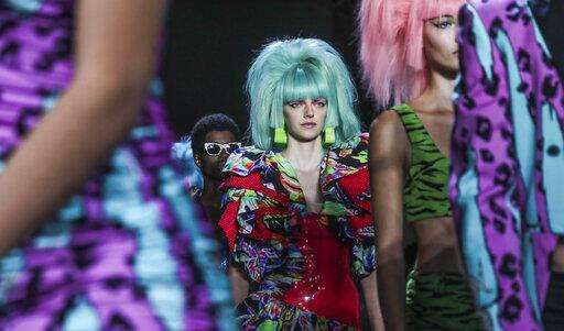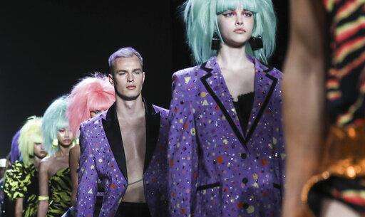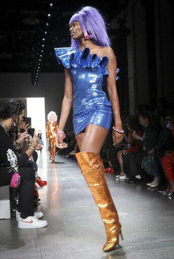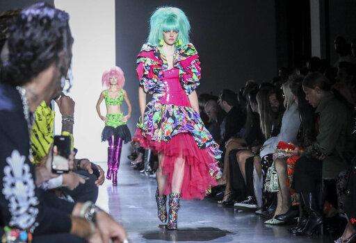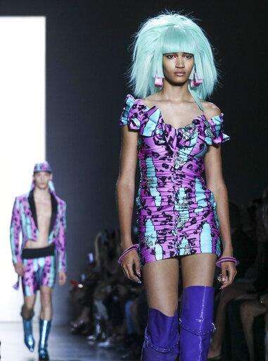 NEW YORK (AP) - Designer Jeremy Scott sent his models down the runway in electric hues, crystal-embedded garments, sparkly sky-high boots and brightly colored wigs, evoking what he called an "intergalactic pop band."