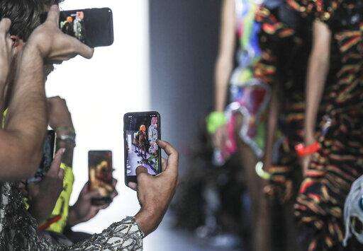 Guests grab cellphone photos of models in the latest fashion creation from Jeremy Scott, during New York's Fashion Week, Friday, Sept. 6, 2019. (AP Photo/Bebeto Matthews) The Associated Press