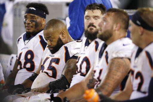 Denver Broncos offensive tackle Elijah Wilkinson (68), offensive guard Ronald Leary (65) and others sit on the bench during the second half of an NFL football game against the Oakland Raiders Monday, Sept. 9, 2019, in Oakland, Calif. Oakland won the game 24-16. (AP Photo/Ben Margot) The Associated Press