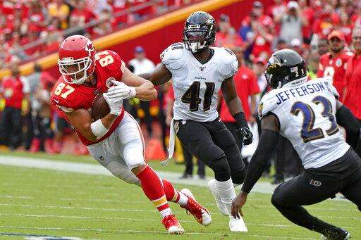 Kansas City Chiefs tight end Travis Kelce (87) runs against Baltimore Ravens safety Tony Jefferson (23) and linebacker Anthony Levine Sr. (41) during the first half of an NFL football game in Kansas City, Mo., Sunday, Sept. 22, 2019. (AP Photo/Ed Zurga) The Associated Press