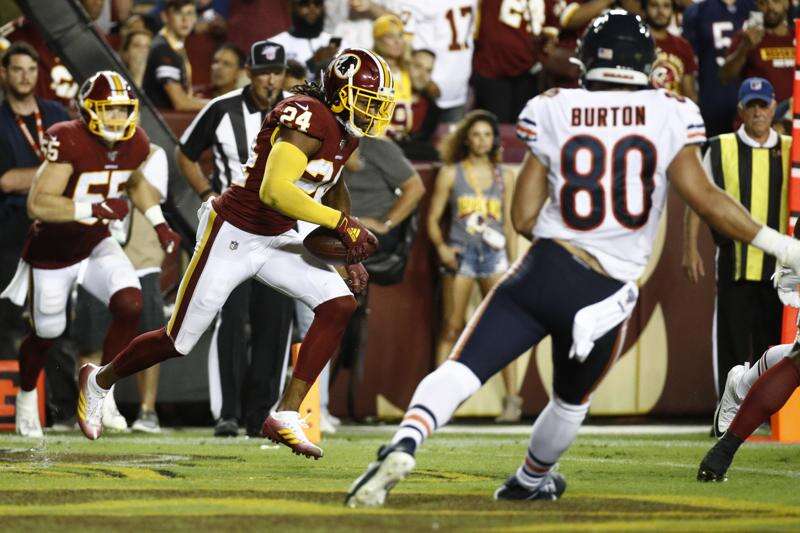 Washington cornerback Josh Norman (24) runs with his interception in front of Chicago Bears tight end Trey Burton (80) during the second half of an NFL football game Monday, Sept. 23, 2019, in Landover, Md.