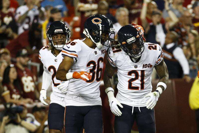 Chicago Bears defensive back DeAndre Houston-Carson (36) celebrates with strong safety Ha Ha Clinton-Dix (21) after Clinton-Dix's interception and runback for a touchdown during the first half of an NFL football game against Washington, Monday, Sept. 23, 2019, in Landover, Md.