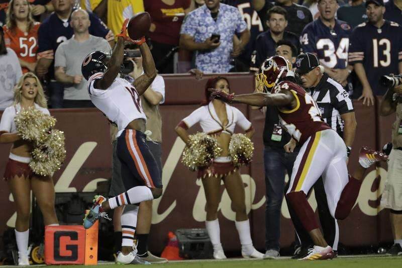 Chicago Bears wide receiver Taylor Gabriel (18) catches a pass for a touchdown in front of Washington cornerback Josh Norman (24) during the first half of an NFL football game Monday, Sept. 23, 2019, in Landover, Md.