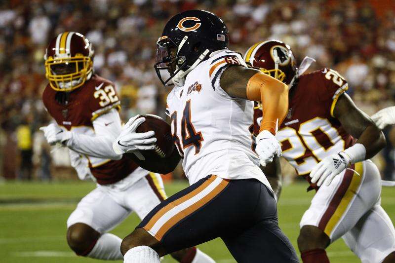 Chicago Bears wide receiver Cordarrelle Patterson (84) runs with ball as he is pursued by Washington cornerback Jimmy Moreland (32) and safety Landon Collins (20) during the first half of an NFL football game Monday, Sept. 23, 2019, in Landover, Md.