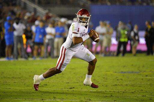 FILE - In this Sept. 14, 2019, file photo, Oklahoma quarterback Jalen Hurts runs the ball during the second half of an NCAA college football game against UCLA in Pasadena, Calif. While Oklahoma appears to have another serious Heisman contender with Big 12 newcomer and dual-threat graduate transfer Jalen Hurts, the Longhorns have one of the eight underclassmen starting quarterbacks in the league. Texas junior Sam Ehlinger is off to a record-setting pace that could also get him in that Heisman conversation.(AP Photo/Mark J. Terrill, File) The Associated Press