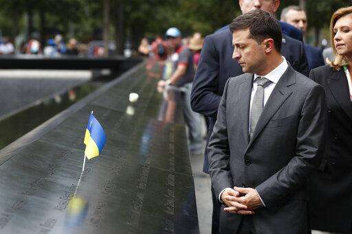 Ukrainian President Volodymyr Zelenskiy has visited the Sept. 11 memorial in New York, viewing the commemorative pools where the World Trade Center's twin towers once stood.