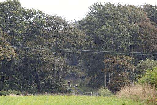 A man walks dogs in a wooded area near Macleod House, which is the site for the proposed 'Trump Estate' in Balmedie, Aberdeenshire, Scotland. President Donald Trumpâs real estate company has received approval for a major housing development of 550 homes on the Menie Estate where one of his golf courses is located. (Andrew Milligan/PA via AP)