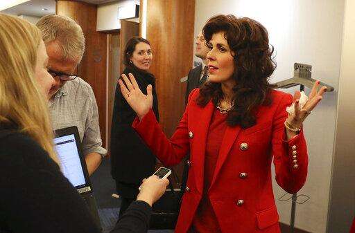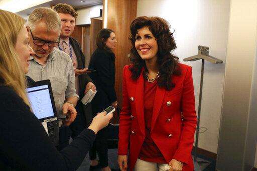 Sarah Malone, Executive Vice President of Trump International Scotland, right, speaks to the media after the approval of a planning application by Trump International Golf Links Ltd in the council chambers of Aberdeenshire Council, for the proposed 'Trump Estate', in Aberdeen, Scotland, Thursday Sept. 26, 2019. Trump International Golf Links Ltd has applied to build 500 residential units, 50 leisure units, and community facilities on land adjacent to the Trump Golf Course (Andrew Milligan/PA via AP)
