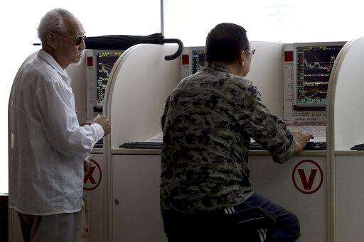 In this Wednesday, Sept. 25, 2019, photo, Chinese men monitor stock prices on computer terminals at a brokerage in Beijing. Asian stock markets followed Wall Street higher Thursday, Sept. 26, 2019, after U.S. President Donald Trump suggested a costly tariff war with China could be resolved soon. (AP Photo/Ng Han Guan) The Associated Press