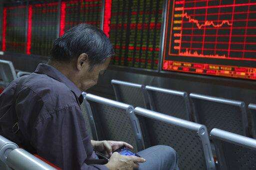 In this Wednesday, Sept. 25, 2019, photo, a Chinese man plays a game on his mobile phone as he monitors stock prices at a brokerage in Beijing. Asian stock markets followed Wall Street higher Thursday, Sept. 26, 2019, after U.S. President Donald Trump suggested a costly tariff war with China could be resolved soon. (AP Photo/Ng Han Guan) The Associated Press