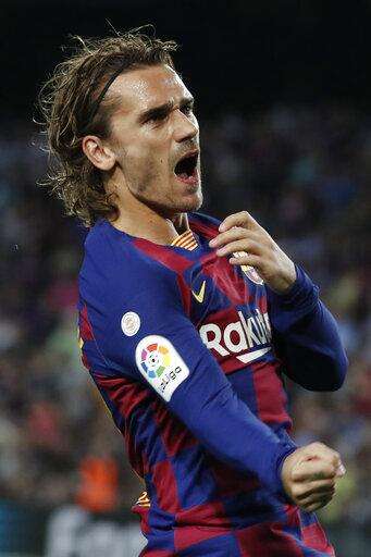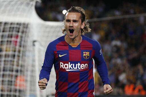 Barcelona's Antoine Griezmann celebrates after scoring the opening goal during the Spanish La Liga soccer match between FC Barcelona and Villarreal CF at the Camp Nou stadium in Barcelona, Spain, Tuesday, Sep. 24, 2019. (AP Photo/Joan Monfort) The Associated Press