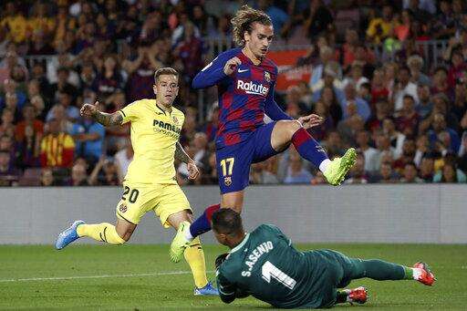 Villareal's goalkeeper Sergio Asenjo saves at the feet of Barcelona's Antoine Griezmann during the Spanish La Liga soccer match between FC Barcelona and Villarreal CF at the Camp Nou stadium in Barcelona, Spain, Tuesday, Sep. 24, 2019. (AP Photo/Joan Monfort) The Associated Press