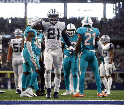 Dallas Cowboys running back Ezekiel Elliott (21) celebrates his run for a first down in the second half of an NFL football game against the Miami Dolphins in Arlington, Texas, Sunday, Sept. 22, 2019. (AP Photo/Ron Jenkins) The Associated Press
