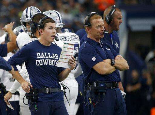 Dallas Cowboys offensive coordinator Kellen Moore, left, makes a call as head coach Jason Garrett, right, stands by in the first half of an NFL football game against the Miami Dolphins in Arlington, Texas, Sunday, Sept. 22, 2019. (AP Photo/Ron Jenkins) The Associated Press