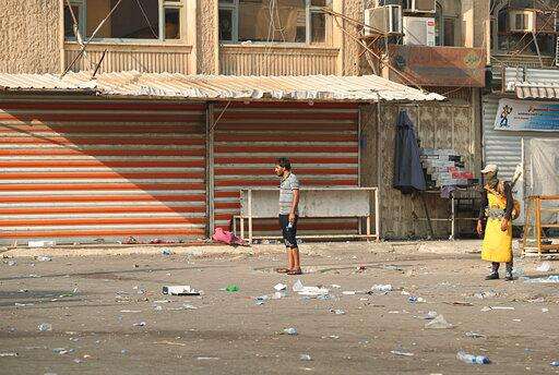 A protester and a street vendor who sells drinks stand near closed shops after a curfew was announced, in Baghdad, Iraq, Thursday, Oct. 3, 2019. Iraqi security forces fired live bullets and tear gas against protesters in Baghdad, Thursday. This came hours after a curfew was announced in the Iraqi capital amid deadly violence gripping the country and anti-government protests that killed over 18 people this week. (AP Photo/Hadi Mizban)