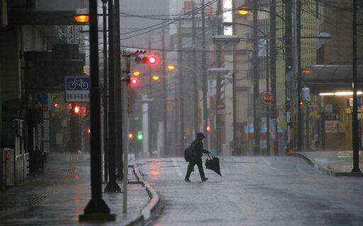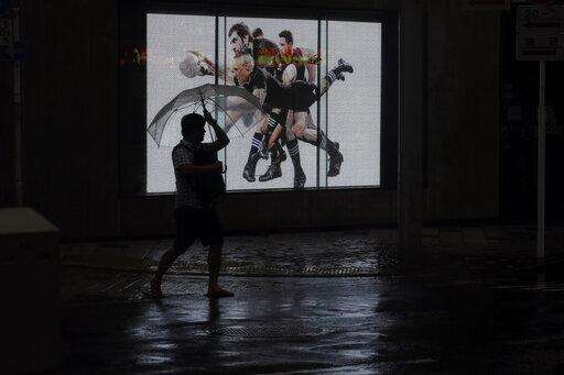 A woman crosses the road in Hamamatsu, central Japan, Saturday, Oct. 12, 2019. A heavy downpour and strong winds pounded Tokyo and surrounding areas on Saturday as a powerful typhoon forecast as the worst in six decades approached landfall, with streets and train stations deserted and shops shuttered. (AP Photo/Christophe Ena)