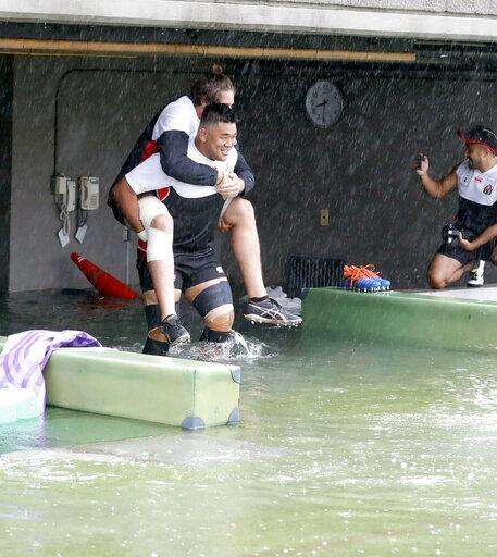 Japan's rugby team player Jiwon Koo, carries teammate James Moore in a flooded walkway at a stadium in Tokyo as the team practices ahead of their match against Scotland, Saturday, Oct. 12, 2019. Tokyo and surrounding areas braced for a powerful typhoon forecast as the worst in six decades, with streets and trains stations unusually quiet Saturday as rain poured over the city. (Yuki Sato/Kyodo News via AP)