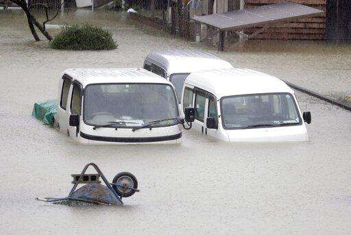 Cars sit submerged in water in the residential area hit by Typhoon Hagibis, in Ise, central Japan Saturday, Oct. 12, 2019. A heavy downpour and strong winds pounded Tokyo and surrounding areas on Saturday as a powerful typhoon forecast as the worst in six decades approached landfall, with streets and train stations deserted and shops shuttered.(Kyodo News via AP)