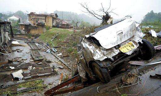 A damaged car lies on the ground following a strong wind in Ichihara, Chiba, near Tokyo Saturday, Oct. 12, 2019. Under gloomy skies, a tornado ripped through Chiba on Saturday.(Kyodo News via AP)