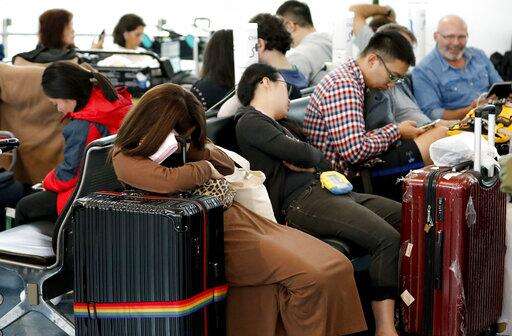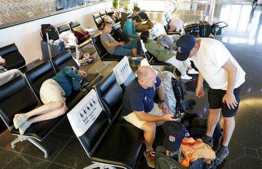 Passengers, including a British man who came for the Rugby World Cup, rest and wait for their flights which were cancelled because of Typhoon Hagibis, at Haneda Airport in Tokyo, Saturday, Oct. 12, 2019. Tokyo and surrounding areas braced for a powerful typhoon forecast as the worst in six decades, with streets and trains stations unusually quiet Saturday as rain poured over the city. (Kyodo News via AP)