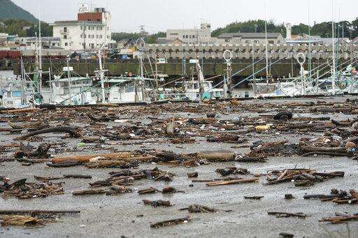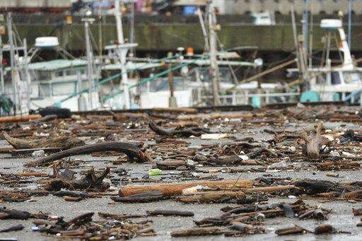 Sea wracks land at a port as Typhoon Hagibis approaches in town of Kiho, Mie prefecture, central Japan Saturday, Oct. 12, 2019. Tokyo and surrounding areas braced for a powerful typhoon forecast as the worst in six decades, with streets and trains stations unusually quiet Saturday as rain poured over the city. (AP Photo/Toru Hanai)