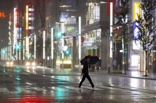 A man walks a pedestrian crossing at Ginza shopping district in the pouring rain due to Typhoon Hagibis in Tokyo Saturday, Oct. 12, 2019. A heavy downpour and strong winds pounded Tokyo and surrounding areas on Saturday as a powerful typhoon forecast as the worst in six decades approached landfall, with streets and train stations deserted and shops shuttered. (AP Photo/Eugene Hoshiko)