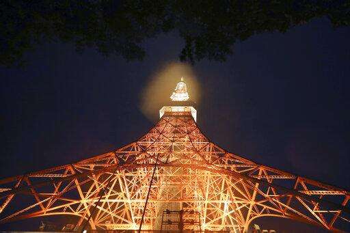 Tokyo Tower is lit in the pouring rain due to Typhoon Hagibis in Tokyo Saturday, Oct. 12, 2019. A heavy downpour and strong winds pounded Tokyo and surrounding areas on Saturday as a powerful typhoon forecast as the worst in six decades approached landfall, with streets and train stations deserted and shops shuttered. (AP Photo/Eugene Hoshiko)