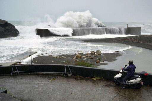 A man on a scooter watches as surging waves hit against the breakwater as Typhoon Hagibis approaches a port in Kumano, Mie Prefecture, Japan, Saturday, Oct. 12, 2019. (AP Photo/Toru Hanai)