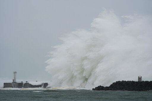 Surging waves hit against the breakwater and a lighthouse as Typhoon Hagibis approaches at a port in town of Kiho, Mie prefecture, central Japan Saturday, Oct. 12, 2019. Tokyo and surrounding areas braced for a powerful typhoon forecast as the worst in six decades, with streets and trains stations unusually quiet Saturday as rain poured over the city. (AP Photo/Toru Hanai)