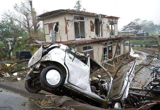 Destroyed house and vehicle are seen following a strong wind in Ichihara, Chiba, near Tokyo Saturday, Oct. 12, 2019. Tokyo and surrounding areas braced for a powerful typhoon forecast as the worst in six decades, with streets and trains stations unusually quiet Saturday as rain poured over the city. (Katsuya Miyagawa/Kyodo News via AP)