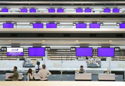 Check-in counter is deserted at Narita international airport in Narita, east of Tokyo, as Typhoon Hagibis is approaching Saturday, Oct. 12, 2019. A heavy downpour and strong winds pounded Tokyo and surrounding areas on Saturday as a powerful typhoon forecast to be Japan's worst in six decades made landfall southwest of Tokyo, with streets, beaches and train stations deserted. All Nippon Airways and Japan Airlines grounded most domestic and international flights at the Tokyo, Osaka and Nagoya airports. (Kyodo News via AP)
