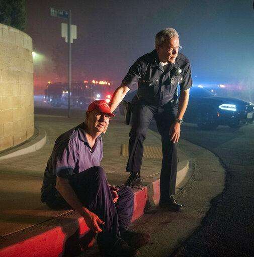 Los Angeles Police Department Chief Michel Moore tells resident Jerry Rowe that firefighters are coming after the roof of Rowe's home caught fire from the Saddleridge fire in Granada Hills, Calif., Friday, Oct. 11, 2019. (AP Photo/Michael Owen Baker)