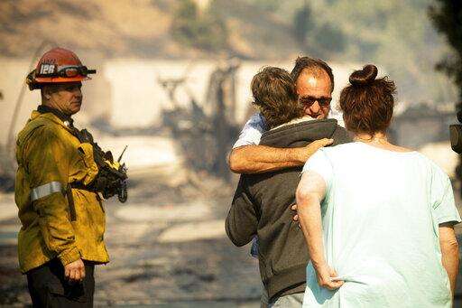 Eyed Jarjour comforts a neighbor who lost his Jolette Ave. home to the Saddleridge Fire on Friday, Oct. 11, 2019, in Granada Hills, Calif. (AP Photo/Noah Berger)