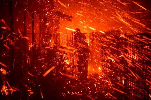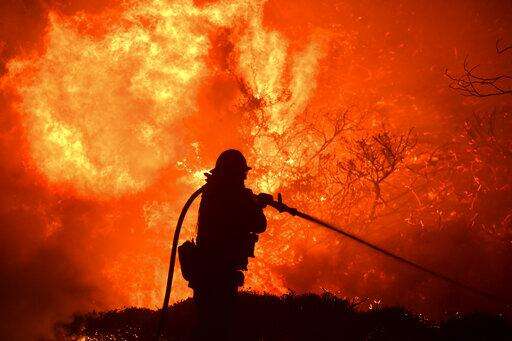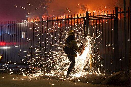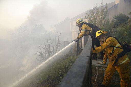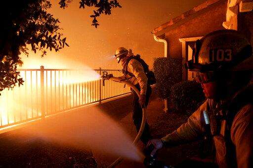 A firefighter sprays water in front of an advancing wildfire Friday, Oct. 11, 2019, in Porter Ranch, Calif. (AP Photo/Marcio Jose Sanchez)