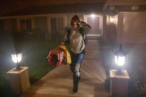 A woman evacuates her home with her cat as the Saddleridge fire threatens homes in Granada Hills, Calif., Friday, Oct. 11, 2019. (AP Photo/Michael Owen Baker)