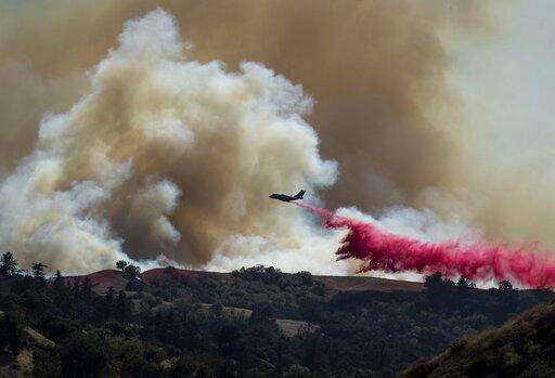 A tanker drops retardant on the Saddleridge Fire burning in Newhall, Calif., on Friday, Oct. 11, 2019. (AP Photo/Noah Berger)