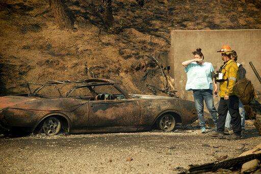 A resident surveys the scorched remains of her home and vehicle after the Saddleridge Fire burned through Granada Hills, Calif., on Friday, Oct. 11, 2019. (AP Photo/Noah Berger)