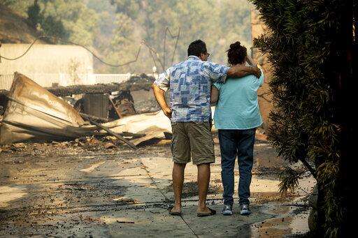 Eyed Jarjour, left, comforts a neighbor who lost her Jolette Ave. home to the Saddleridge Fire on Friday, Oct. 11, 2019, in Granada Hills, Calif. (AP Photo/Noah Berger)