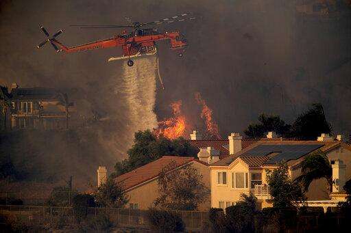 A helicopter drops water while battling the Saddleridge fire in Porter Ranch, Calif., on Friday, Oct. 11, 2019. (AP Photo/Noah Berger)