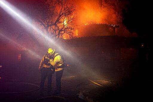In this Thursday, Oct. 10, 2019 photo, Los Angeles City firefighters battle the Saddleridge fire near homes in Sylmar, Calif. (AP Photo/Michael Owen Baker)