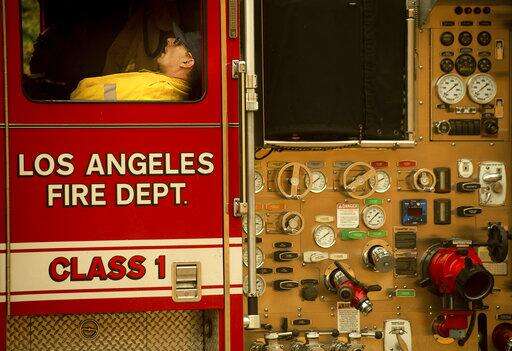 A firefighter rests as crews continue to battle the Saddleridge Fire burning in Porter Ranch, Calif., on Friday, Oct. 11, 2019. (AP Photo/Noah Berger)