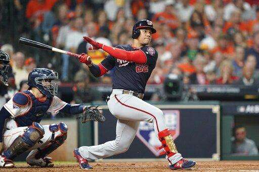 Washington star Juan Soto, who turned 21 Friday, struck out on three pitches against Houston's Gerrit Cole in his first Series at-bat. Then he hit a tying home run leading off the fourth inning, hit a two-run double in the fifth and singled in the eighth to help spark Washington's 5-4 victory. Soto doubled and walked twice as the Nationals romped 12-3 in Game 2.