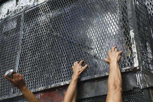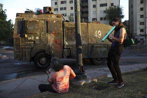 Demonstrators grab on to the metal mesh protecting the driver's cab of a police water cannon during an anti-government protest in Santiago, Chile, Saturday, Oct. 26, 2019. Chile has been facing days of unrest, triggered by a relatively minor increase in subway fares. The protests have shaken a nation noted for economic stability over the past decades, which has seen steadily declining poverty despite persistent high rates of inequality. (AP Photo/Rodrigo Abd) The Associated Press