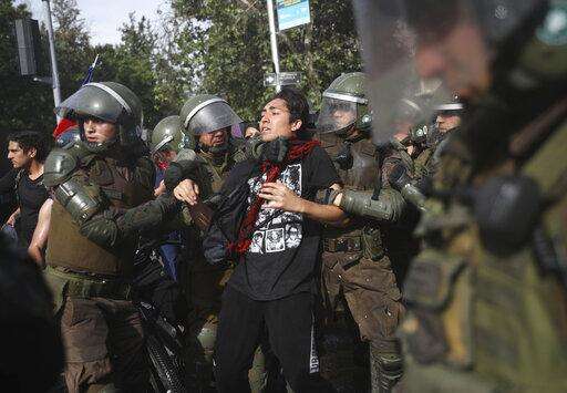 Police detain a man during an anti-government protest in Santiago, Chile, Saturday, Oct. 26, 2019. Chile has been facing days of unrest, triggered by a relatively minor increase in subway fares. The protests have shaken a nation noted for economic stability over the past decades, which has seen steadily declining poverty despite persistent high rates of inequality. (AP Photo/Rodrigo Abd) The Associated Press