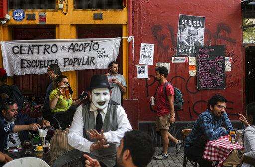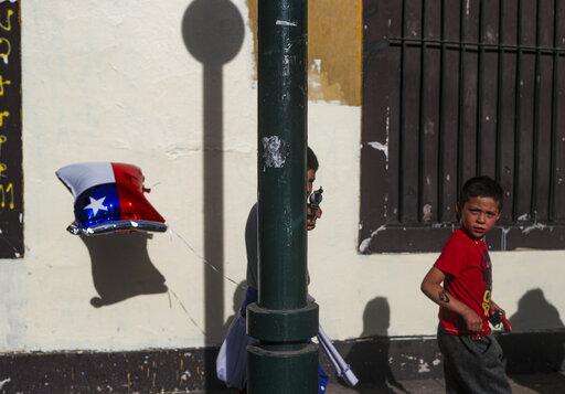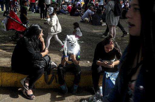 A boy with a wolf mask accompanies his relatives as they sell soft drinks at Plaza Nunoa in Santiago, Chile, Saturday, Oct. 26, 2019. At least 19 people have died in the turmoil that has swept the South American nation. The unrest began as a protest over a 4-cent increase in subway fares and soon morphed into a larger movement over growing inequality in one of Latin America's wealthiest countries. (AP Photo/Esteban Felix) The Associated Press