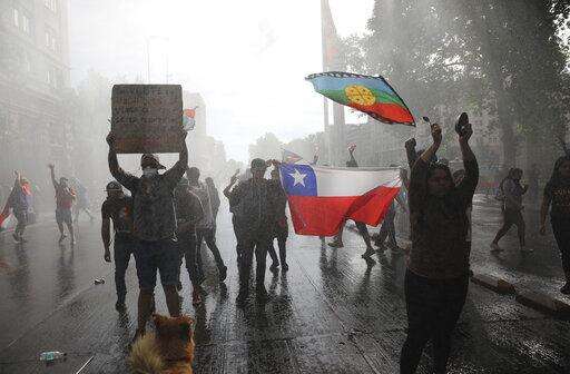 Anti-government demonstrators are sprayed by a police water cannon during a protest in Santiago, Chile, Saturday, Oct. 26, 2019. Chile has been facing days of unrest, triggered by a relatively minor increase in subway fares. The protests have shaken a nation noted for economic stability over the past decades, which has seen steadily declining poverty despite persistent high rates of inequality. (AP Photo/Rodrigo Abd) The Associated Press