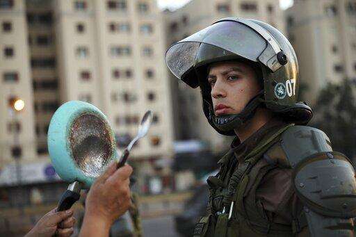 A riot policeman stands guard as an anti-government protester makes noise with a pan in Santiago, Chile, Saturday, Oct. 26, 2019. Chile's President Sebastian Pinera asked all his Cabinet members to offer their resignations on Saturday as he prepared to shake up his government in response to a massive wave of protests, including one that drew more than a million people into the streets the day before. (AP Photo/Rodrigo Abd) The Associated Press