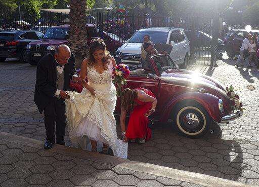 A bride arrives for her wedding at a church in front of Plaza Nunoa in Santiago, Chile, Saturday, Oct. 26, 2019. At least 19 people have died in the turmoil that has swept the South American nation. The unrest began as a protest over a 4-cent increase in subway fares and soon morphed into a larger movement over growing inequality in one of Latin America's wealthiest countries. (AP Photo/Esteban Felix) The Associated Press