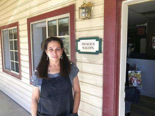 In this Thursday, Oct. 24, 2019, photo, owner Susan Slates, who is a Democrat, poses for picture outside her business "Images Salon" in Agua Dulce, Calif. Slates says she's disappointed but is also sticking with Rep. Katie Hill, D-Calif., who was considered a rising Democratic star, but a looming congressional investigation has put her re-election at risk. In 2018, Hill captured the last Republican-held House seat anchored in Los Angeles County, part of a rout that saw Republicans driven out of a string of U.S. House seats in Southern California. (AP Photo/Michael Blood) The Associated Press